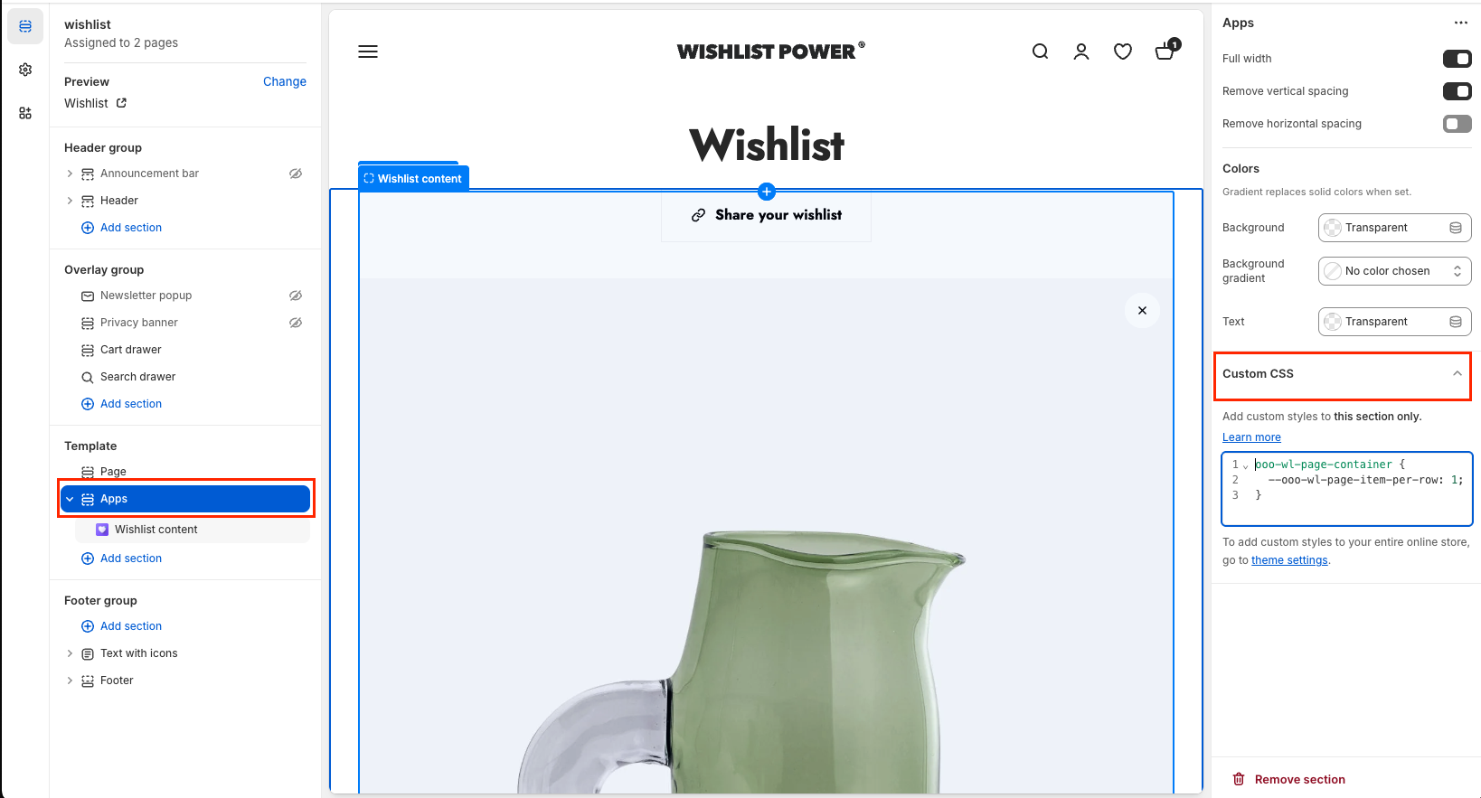 To customize the wishlist page using CSS variables, it is recommended to scope the CSS to the page only. To do that, go to your wishlist page template, click on "Apps":